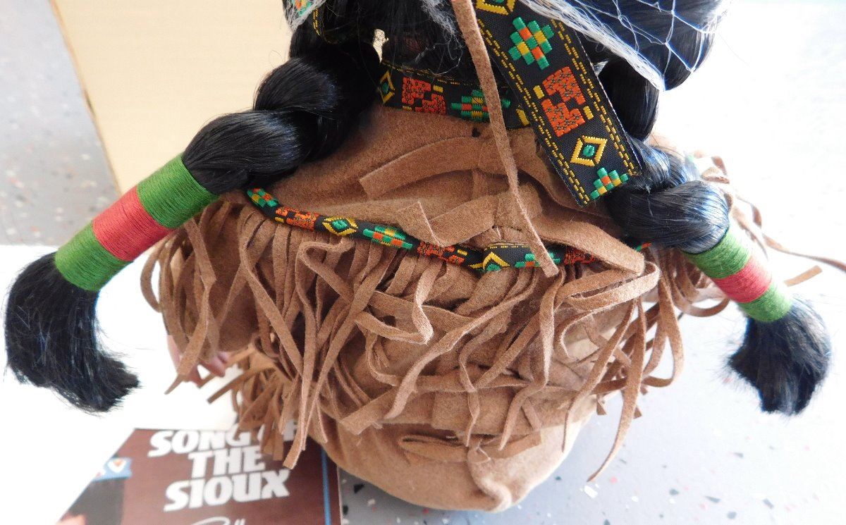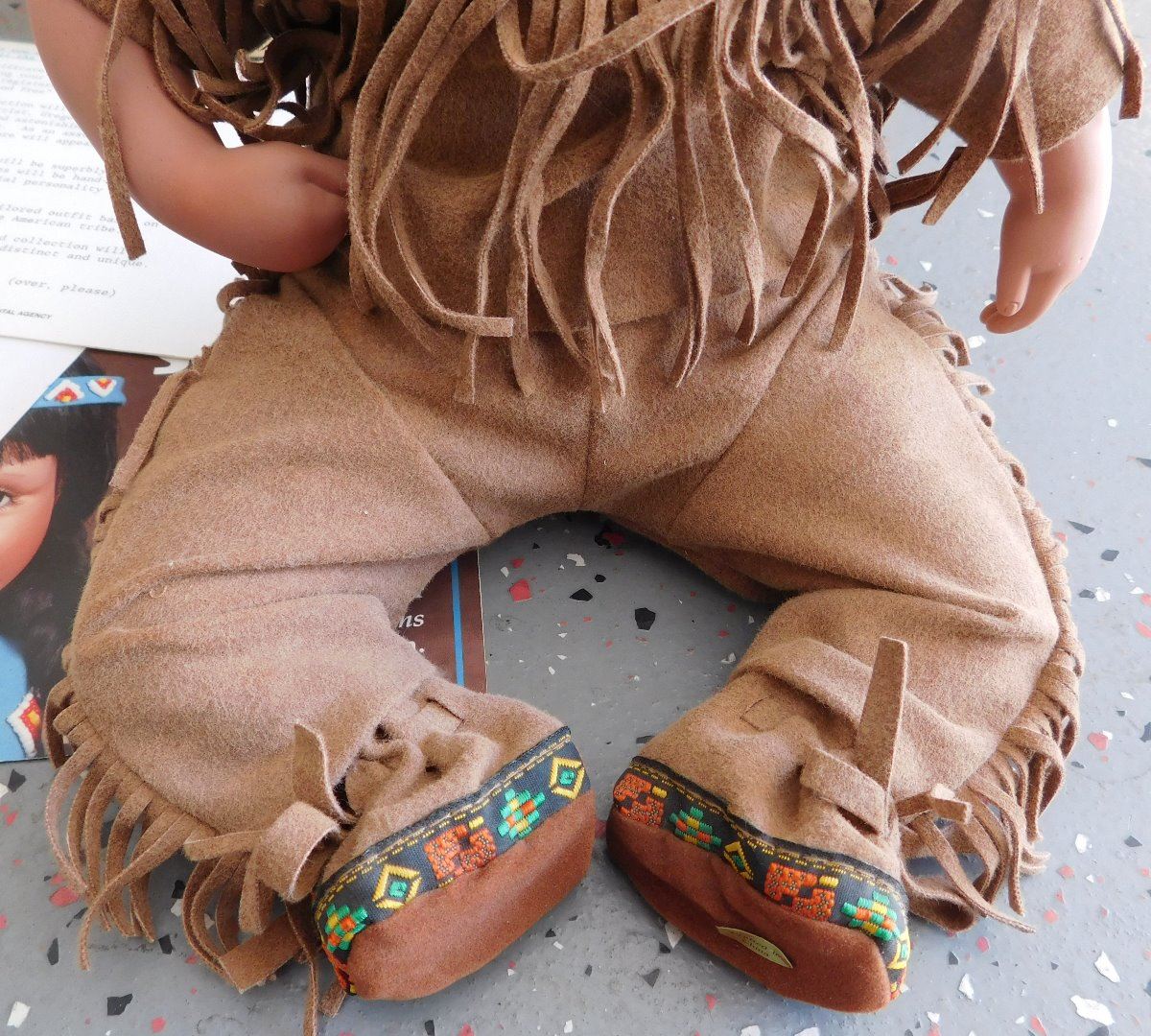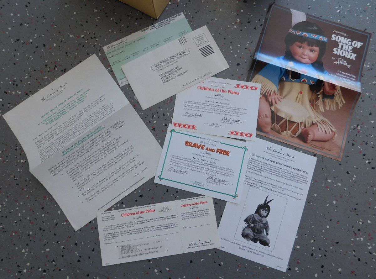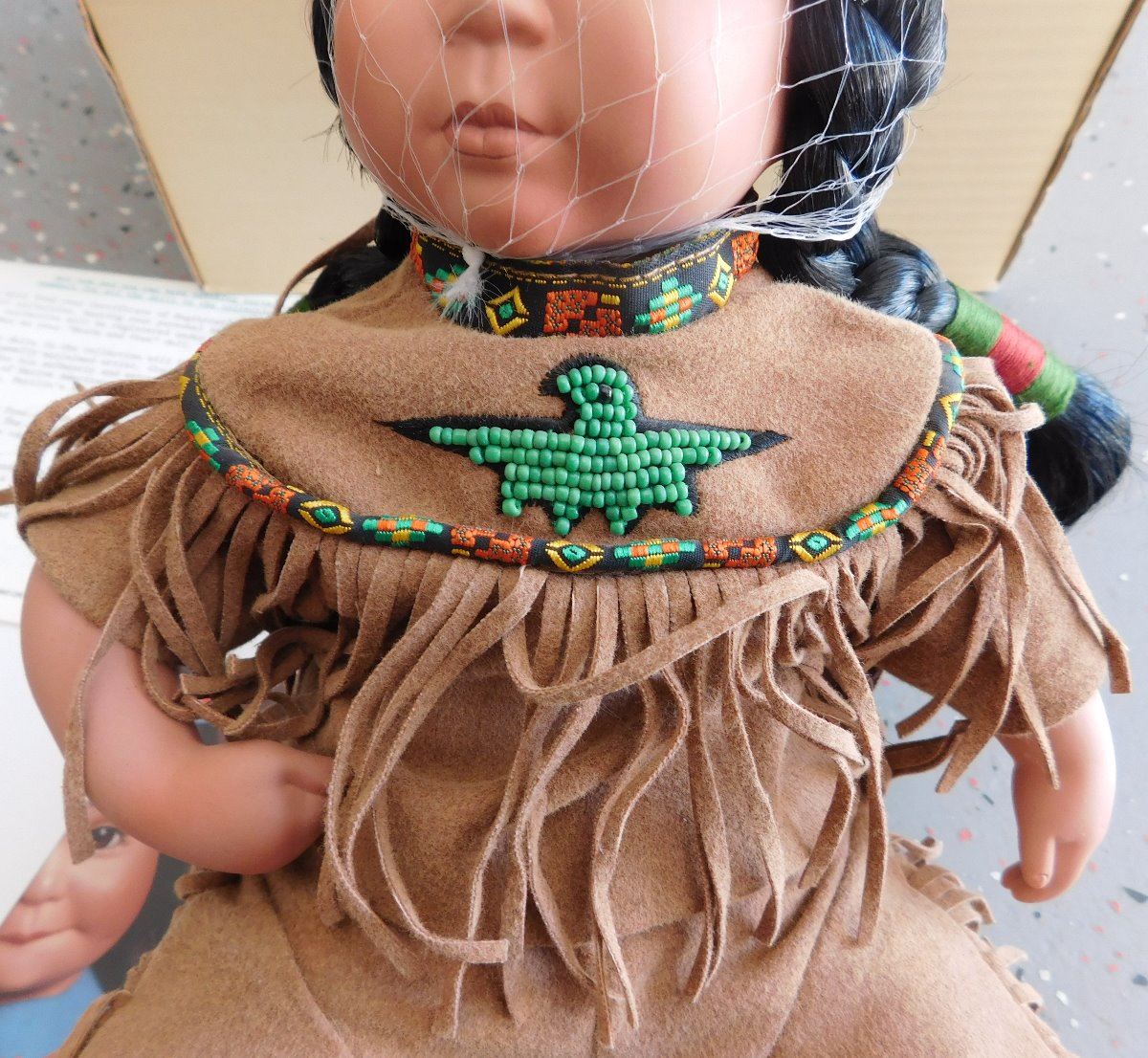 "Brave & Free" Doll by Perillo, 1992. Made of leather, beads, hair, feathers and possibly porcelain or ceramic, the item measures 8.5" x 8" x 12" tall. Sioux-style doll made by Perillo, crafted in China. From the Children of the Plains collection w/original paperwork and box. Condition: Like new, w/original box, see images. Shipping: $30.00 w/insurance and signature.