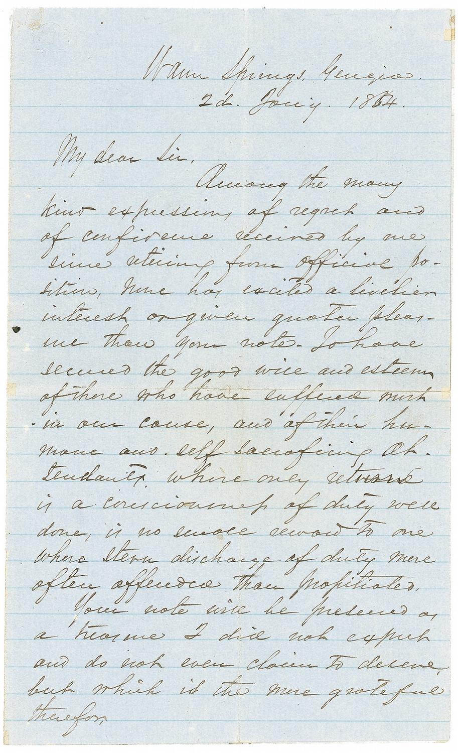 War-dated ALS, three pages, on two adjoining lightly-lined light blue sheets, 5.5 x 9, January 2, 1864. Letter to surgeon S. H. Stout, the medical director of hospitals in Atlanta. In part: “Among the many kind expressions of regret and of confidence received by me since retiring from official position, none has excited a livelier interest or given greater pleasure than your note. To have secured the good will and esteem to those who have suffered most in our cause, and of their humane and self-sacrificing…whose only return is a consciousness of duty well done, is no small reward to one whose stern discharge of duty more often offended than propitiated …
