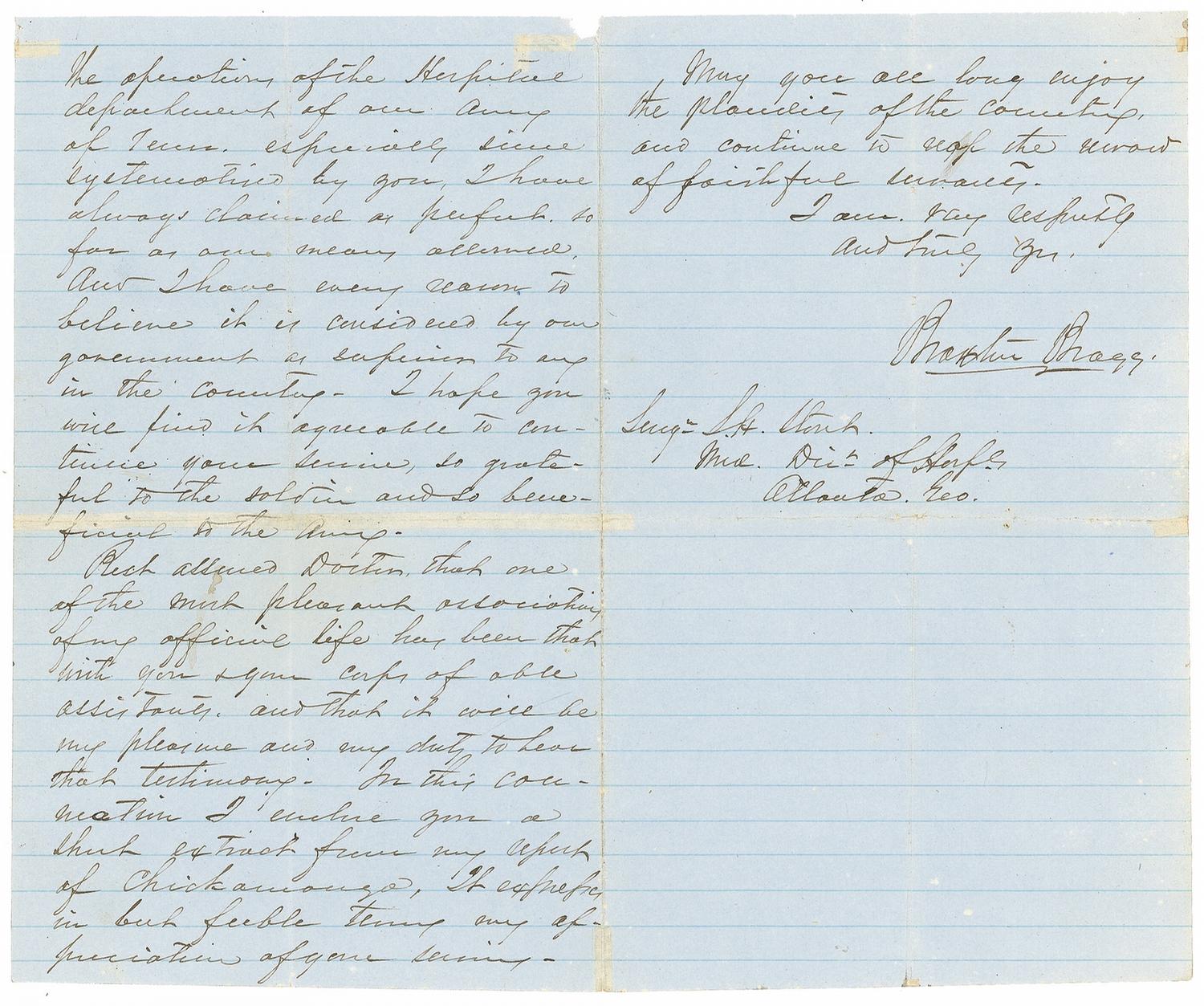 Bragg had recently retired from his “official position” as commander of the Army of Tennessee and was about to be named Jefferson Davis' military advisor when he responded to a letter from a medical director in Georgia. Having been under fire by his subordinate generals for a perceived unwillingness to capitalize on the Confederate victory at Chickamauga, Bragg was grateful to have received correspondence from an ally. He also shows his clear respect for those Confederate troops wounded during the war—“those who have suffered most in our cause”—many of whom were wounded at Chickamauga. The report that Bragg references here would lauded the medical personnel who showed exemplary conduct during the battle—the highest possible praise afforded as individual medals were not awarded. A terrific reference from one of the Confederacy’s greatest generals to one of the South’s key battles.