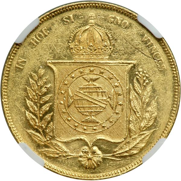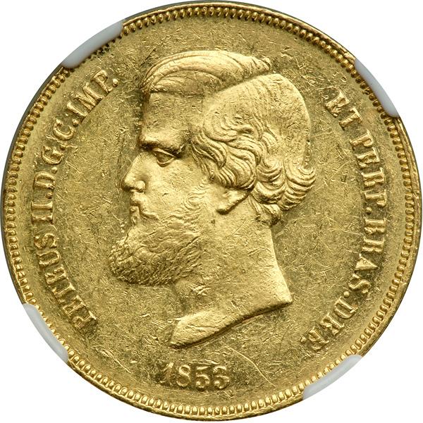 Brazil. 20,000 Reis, 1853. Fr-121a; KM-468. Weight 0.5286. Pedro II, 1831-1889. Bearded older head left. Reverse: Imperial arms. NGC graded AU-55.