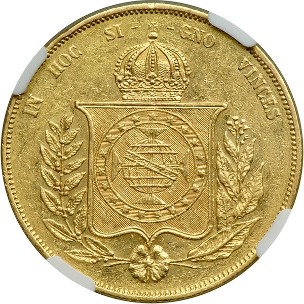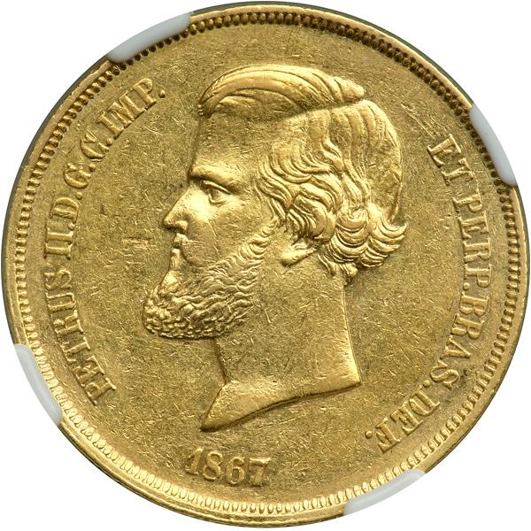 Brazil. 20,000 Reis, 1867. Fr-121a; KM-468. Weight 0.5286. Pedro II, 1831-1889. Bearded older head left. Reverse: Imperial arms. NGC graded AU-58.