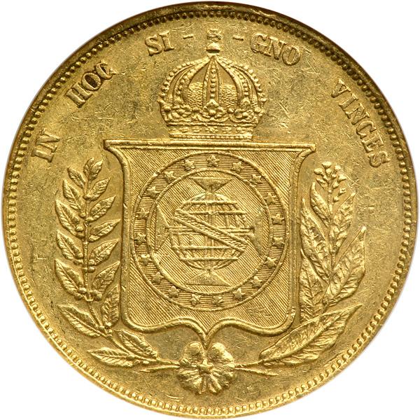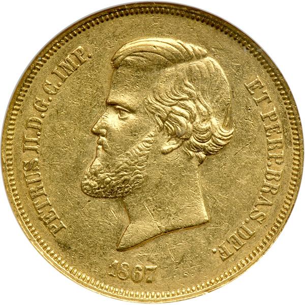 Brazil. 20,000 Reis, 1867. Fr-121a; KM-468. Weight 0.5286. Pedro II, 1831-1889. Bearded older head left. Reverse: Imperial arms. NGC graded AU-55.