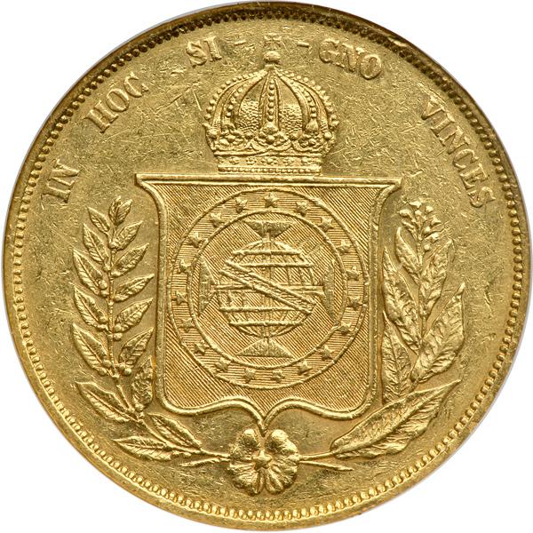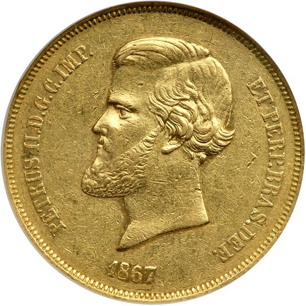 Brazil. 20,000 Reis, 1867. Fr-121a; KM-468. Weight 0.5286. Pedro II, 1831-1889. Bearded older head left. Reverse: Imperial arms. NGC graded AU-55.