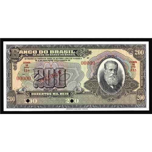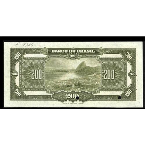 <B>Brazil</B></I> 200 Reis 1923 Pick 121s UNL Specimen<BR>A specimen is not listed in the Krause foreign opus for this design either. A grouping of pinholes is found near the left-hand edge. A pencilled control number is also found on the back, too. <B>Crisp Uncirculated,</B></I> punch cancelled.