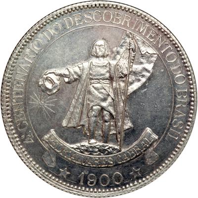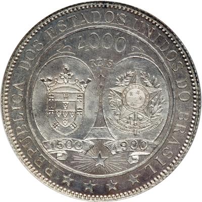 Brazil. 4000 Reis, 1900. KM-502.1; Eliz-89. Variety with 16 rays. Coat of arms of Portugal and Brazil, value above, date below. Reverse: Pedro Alvares Cabbai and star above banner. Brilliant and lustrous. NGC graded MS-63.