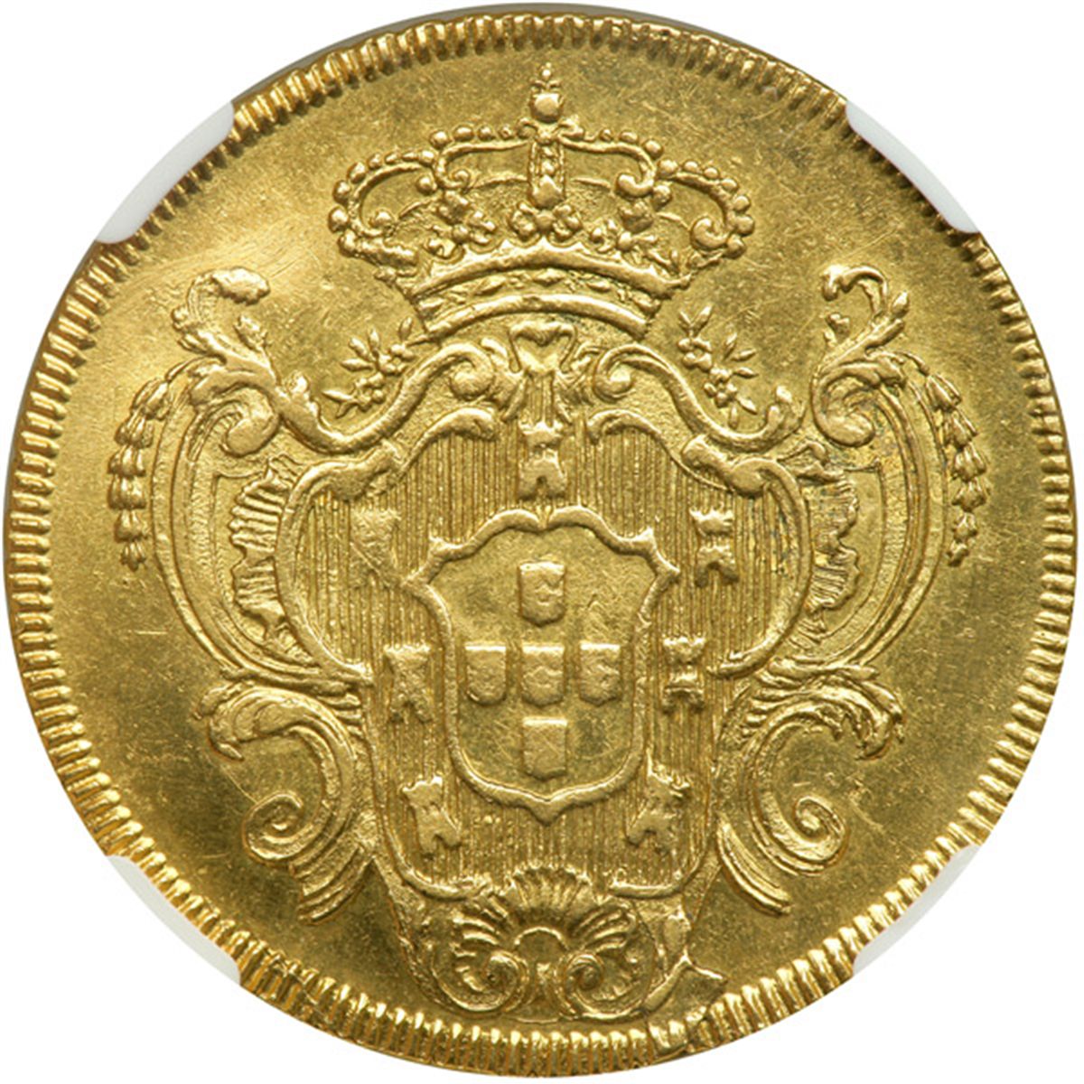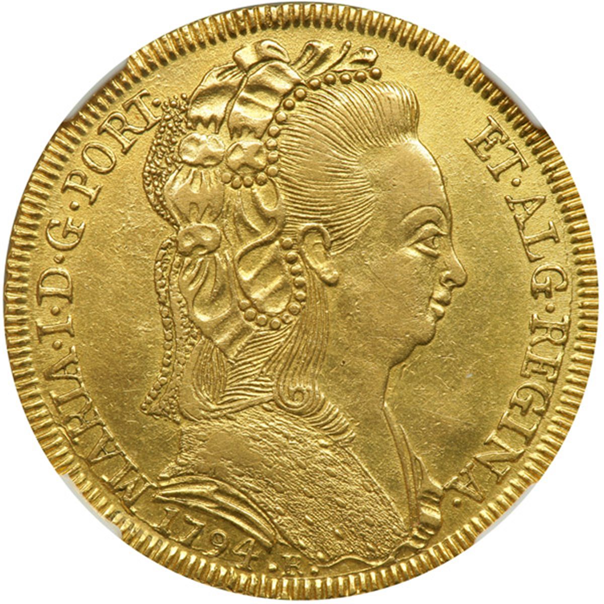 Brazil. 6400 Reis, 1794-R. Fr-85; KM-226.1. Weight 0.4229 ounce. Maria I, 1786-1805. Veiled bust right. Reverse: Crowned arms. NGC graded About Uncirculated, Details (Scratches).