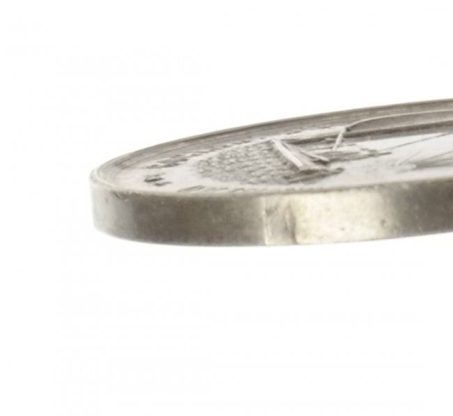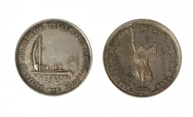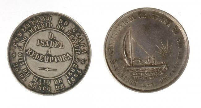 Pair of Rio de Janeiro silver medalets, each with similar size and style. 32mm, 12.8 grams. Common obverse with small boat and setting sun. Each with different reverses. Both are proof-like, Very Fine.