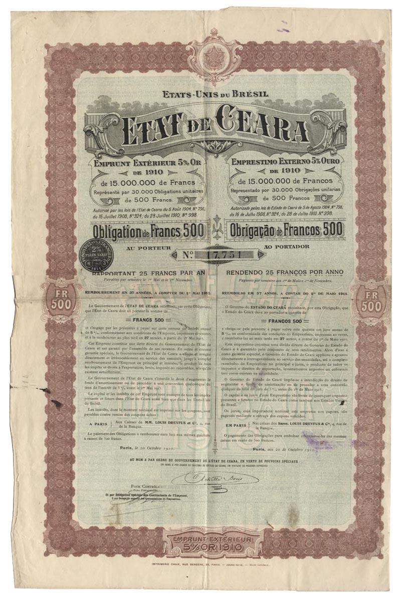 1910, Brazil. 500 franc 25 year bond. Brown/Green. Issued at Paris, France. Ornate design. Litho. Coupons at right. Litho. Uncancelled and Fine.