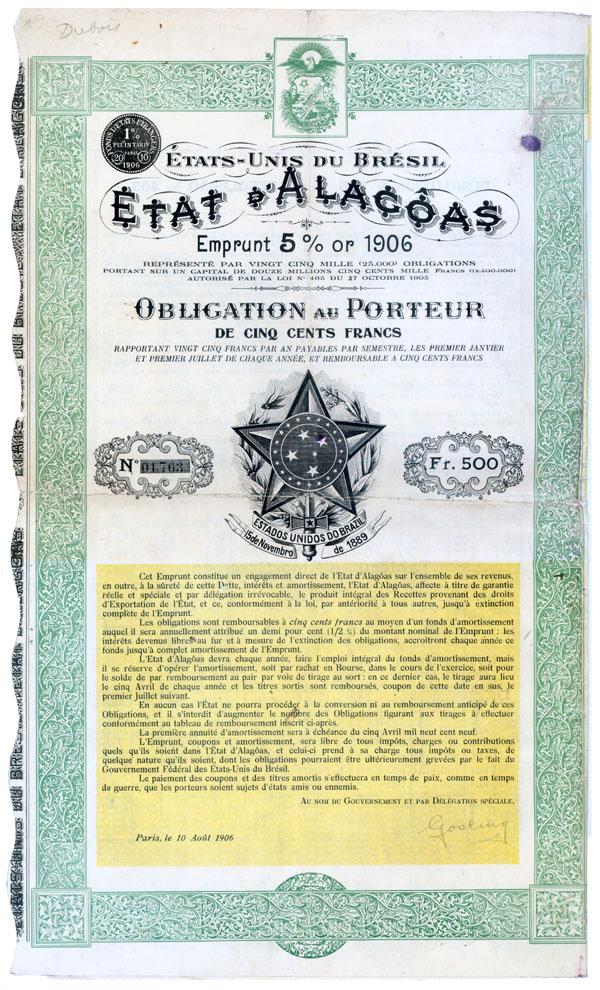 1906, Brazil. 500 franc bond bearing 5% interest. Green|Yellow. Issued at Paris, France. Vignette of the Brazilian Coat of Arms. Litho. Coupons at right. Ink stain at upper right. Folds. Uncancelled and Fine.