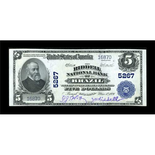 <B>Brazil, IN</B></I> - $5 1902 Plain Back Fr. 607 <B>The Riddell NB</B></I> Ch. # 5267<BR> This lovely note is one of only two large examples from this private name institution to be listed as nicer than Extremely Fine in the census. with its bright white paper, bold blue overprint, and vivid purple signatures it appears new at first glance, but there is a well concealed horizontal fold that compels a grade of <B>About Uncirculated. </B></I>J.H. Riddell, the bank's namesake, signs as President. <BR><I>From The Thomas M. Flynn Collection</B></I><BR><BR><b>Shipping:</b> Coins & Currency (<a target="_blank" href="http://www.heritageauctions.com/common/shipping.php">view shipping information</a>)