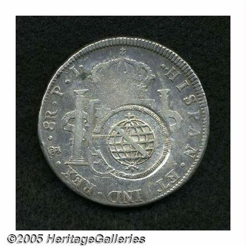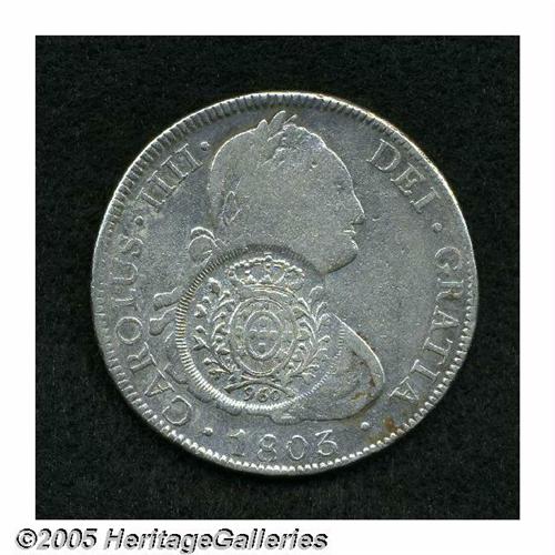 <B>Minas Gerais. 960 Reis Counterstamp (1808), </B></I>KM242, the crowned shield and globe counterstamps on Bolivia 8 Reales 1803-PJ. Host coin is F-VF and the counterstamps are VF+.