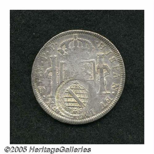 <B>Minas Gerais. 960 Reis Counterstamp (1808), </B></I>KM242, crowned shield and globe c/s on Bolivia 8 Reales (date effaced) but assayer PP (1801-2 only.) Nicely toned VF host coin and lustrous AU counterstamp - very attractive combination.