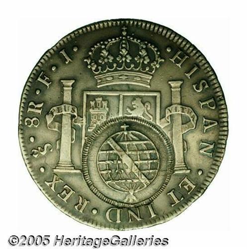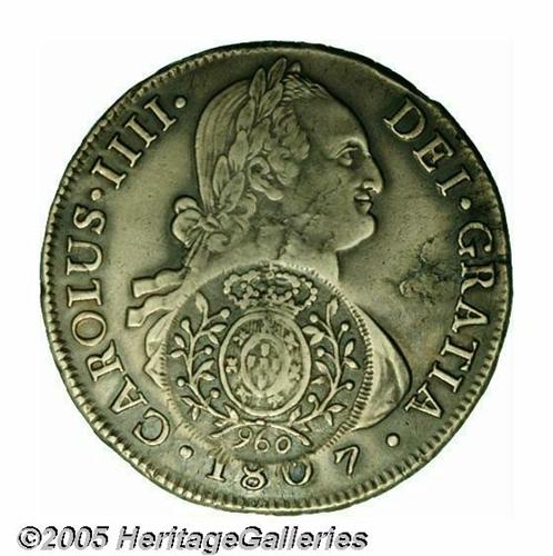 <B>Minas Gerais. 960 Reis Counterstamp (1808), </B></I>KM243, crowned shield and globe counterstamps on Chile 8 Reales 1807-FJ. This is a very rare host coin for this issue. Nicely toned XF host coin and counterstamps.