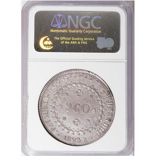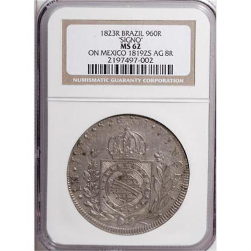 <B>Pedro I 960 Reis 1823R Signo,</B></I> KM368.1, MS62 NGC, nicely toned, the host coin is a Mexico 8 Reales Zacatecas 1819-AG, very scarce host coin.<BR><BR><b>Shipping:</b> Coins & Currency (<a target="_blank" href="http://www.heritageauctions.com/common/shipping.php">view shipping information</a>)