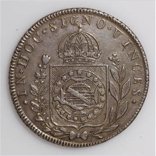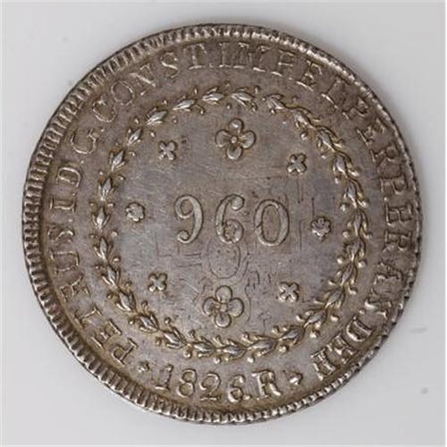 <B>Pedro I 960 Reis 1826R Star,</B></I> KM368.1, nicely toned XF-AU, struck over a Spanish colonial 8 Reales. The SCWC lists this date with a cross above the crown, but this example clearly displays a nine pointed star. An interesting variety of uncertain rarity.<BR><BR><b>Shipping:</b> Coins & Currency (<a target="_blank" href="http://www.heritageauctions.com/common/shipping.php">view shipping information</a>)