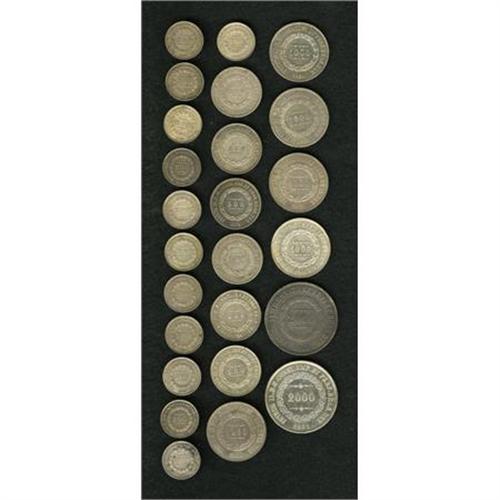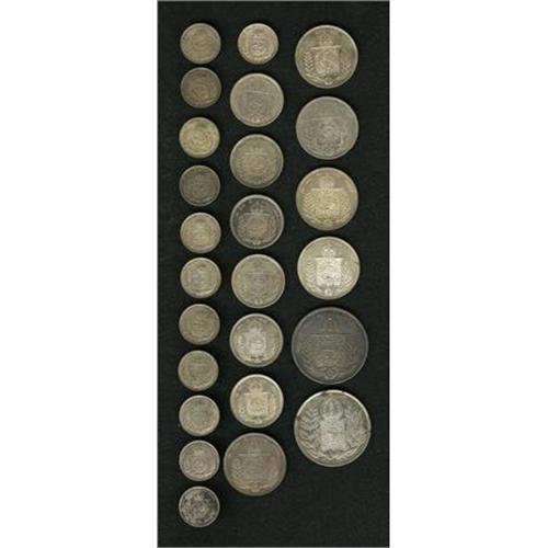 <B>Pedro II Silver Date Collection,</B></I> KM469 200 Reis (12) featuring: 1855, 1857, 1858, 1859, 1860, 1861, 1862, 1863, 1864, 1865, 1866, 1867, KM464 500 Reis (6), 1854, 1859, 1860, 1861, 1862, 1866, KM465 1000 Reis (5), 1857, 1858, 1860, 1861, 1866, KM462 2000 Reis 1851, and KM466 2000 Reis 1855. Grades range from VF to AU. <B>Sold as is, no return lot.</B></I><BR><BR><b>Shipping:</b> Coins & Currency (<a target="_blank" href="http://www.heritageauctions.com/common/shipping.php">view shipping information</a>)
