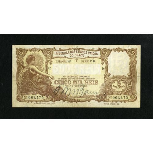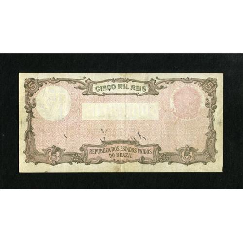 <B>Brazil </B></I>5 Mil Reis (1903) Pick 19 <BR> An approximate quarter inch top edge tear is noticed. <B>Very Fine.</B></I><BR><BR><b>Shipping:</b> Coins & Currency (<a target="_blank" href="http://www.heritageauctions.com/common/shipping.php">view shipping information</a>)