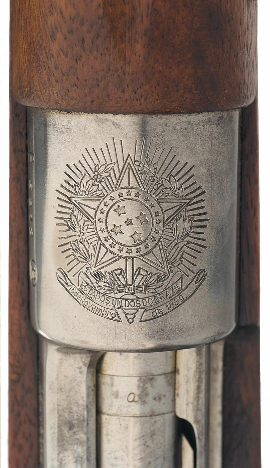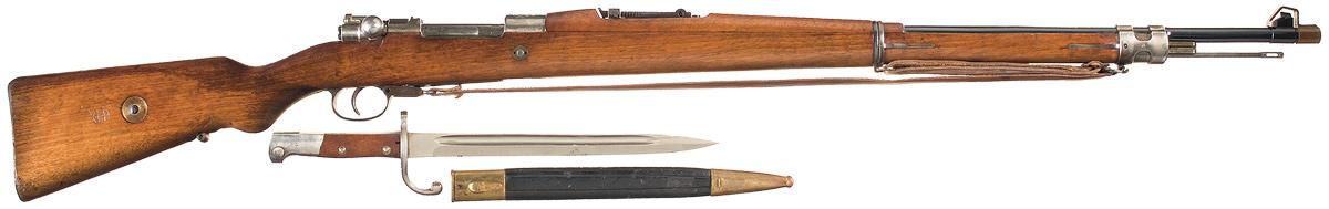 This is a nice representative example of a Brazilian contract Model 1908 rifle. The front receiver ring is marked with the Brazilian crest on top, "MOD. 1908." on the right side and a "B", serial number circled "B" on the left side. The left receiver wall is marked "DEUTSCHE WAFFEN-UND / MUNITIONSFABRIKEN. BERLIN". Ramped blade front sight and tangent rear sight graduated to 2,000 meters. Bright front barrel band, bolt assembly and receiver with the remaining parts blue. Mounted on a one piece walnut pistol grip stock with matching handguard, white painted "191" on the left rear and the six pointed star DWM (Loewe) cartouche on the right rear. Complete with a bayonet with smooth wood handle and leather scabbard with brass throat and tip, leather sling, cleaning rod and front sight/muzzle cover.