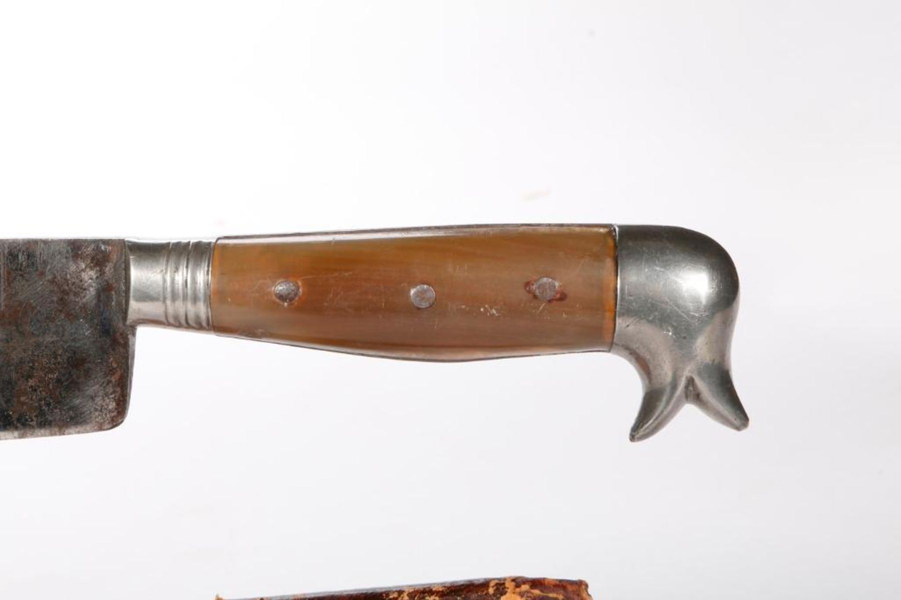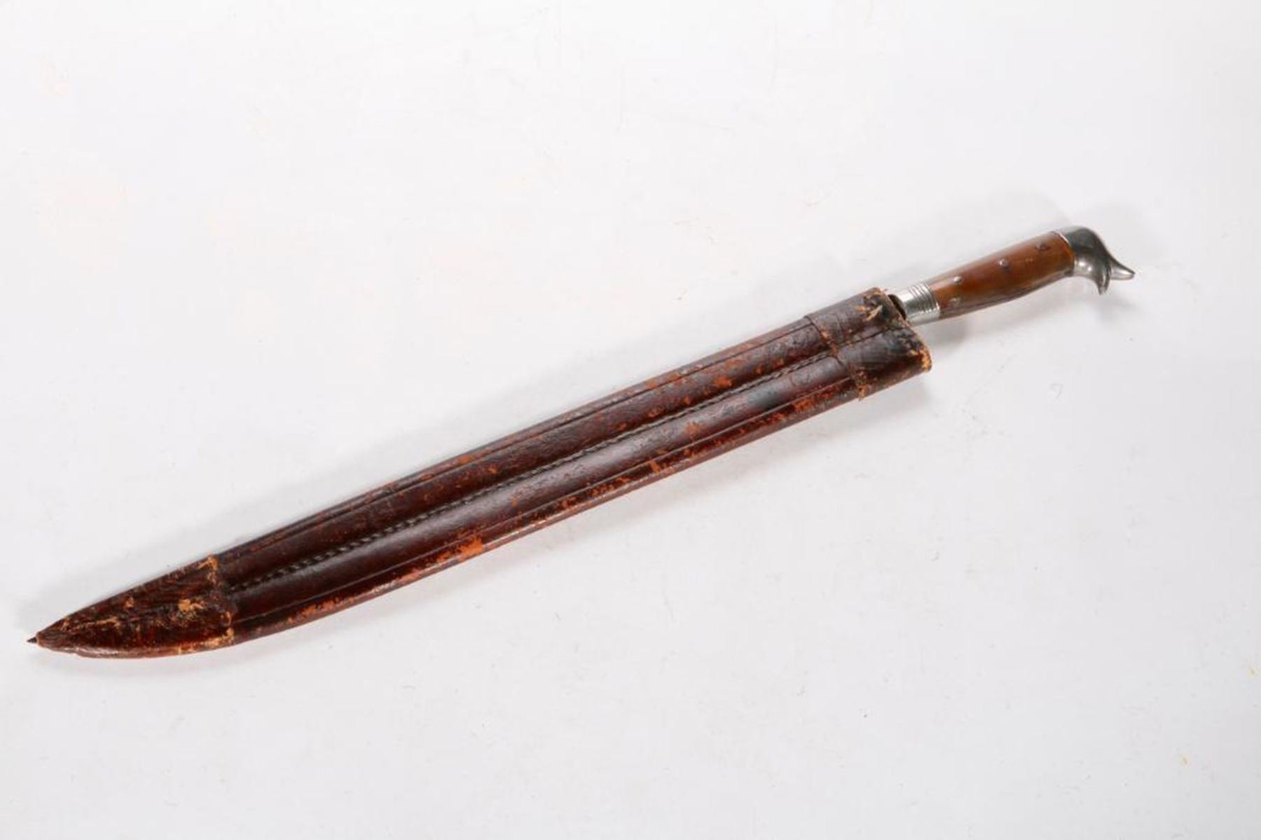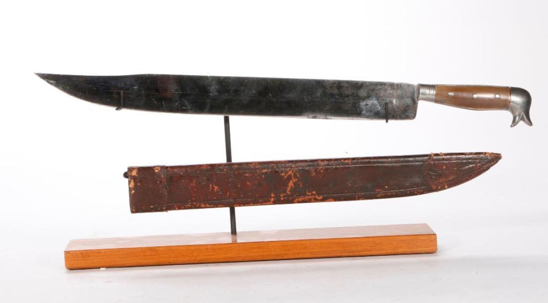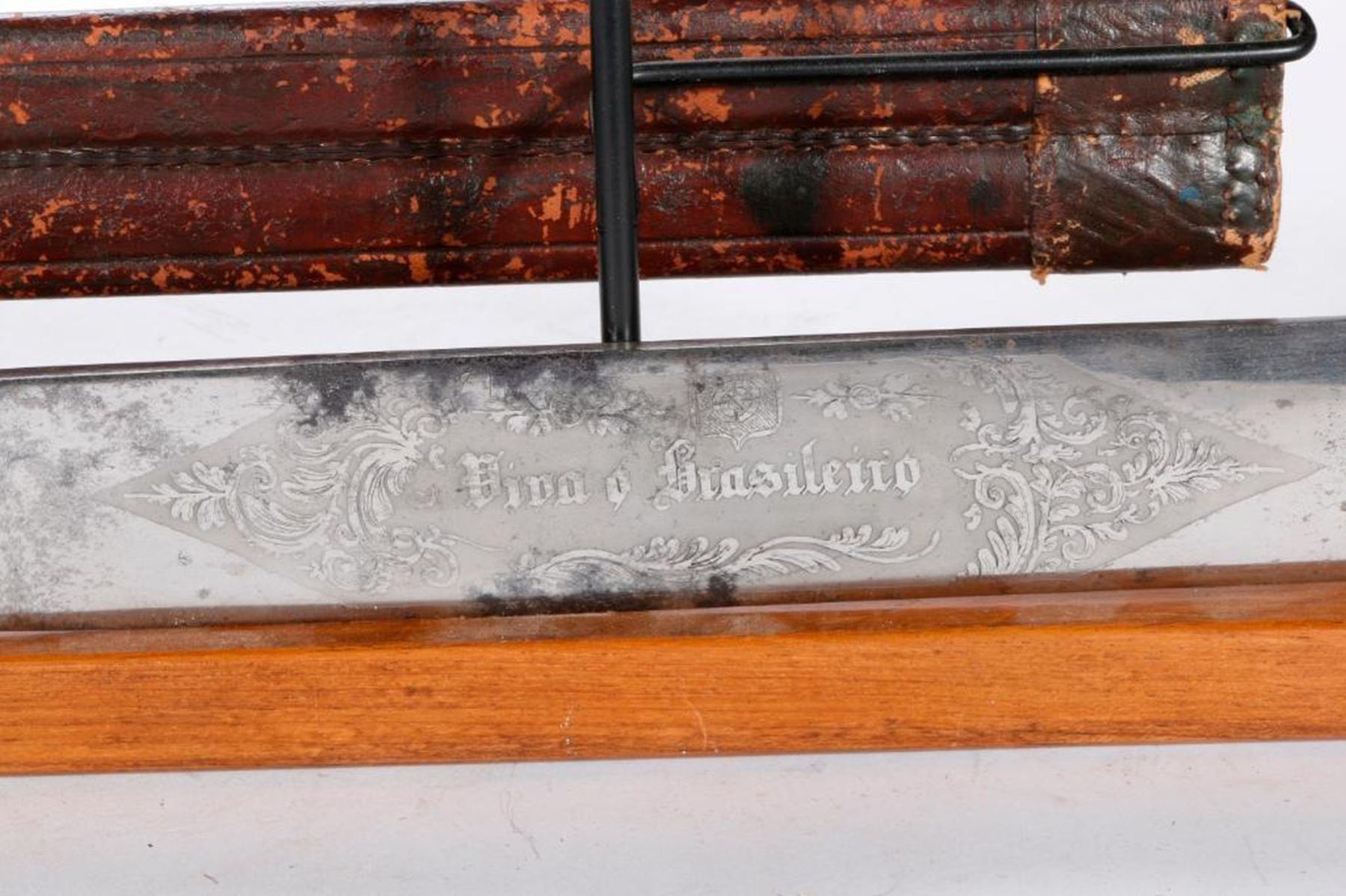 c. first half 20th century, bearing an inscription translated as "long live the Brazilians", with leather sheath 7 1/2 inches high on stand x 21 1/2 x 3.