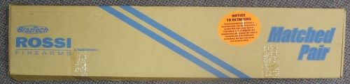 Braztech Rossi Matched Pair Muzzleloader Shotgun and Muzzleloader Combo. 20 Gauge/ 50 blkpwdr. ActioN: Single shot. Stock: walnut finish hardwood. Capacity 1. Chokes: Fixed modified. Chamber 3". Safety: transfer bar, Taurus security system. Sights: Shotgun: Bead Rifle: fiber optic. Barrel length: shotgun 28":, rifle 23". Weight: shotgun 5.6 lbs. Rifle 6.3 lbs. Packaging: soft zippered case. Features: scope mount base.
