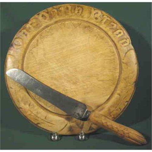 "OUR DAILY BREAD" is carved into the board which measures 11.1/2" across. The knife is 12" long. Beautiful rich patina on both. The knife blade is marked "Encore Thomas Turner & Co Cutlers to his Majesty That would be Edward V11.