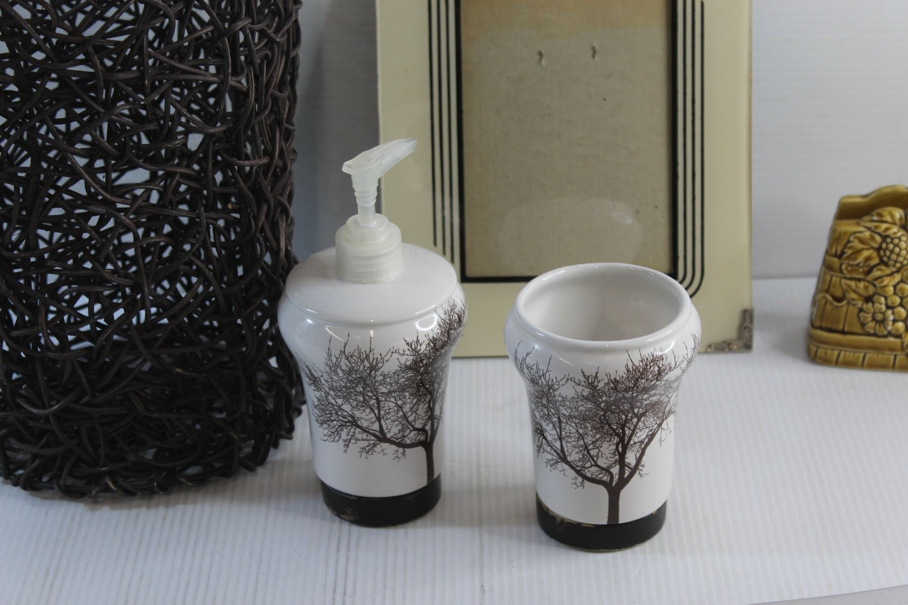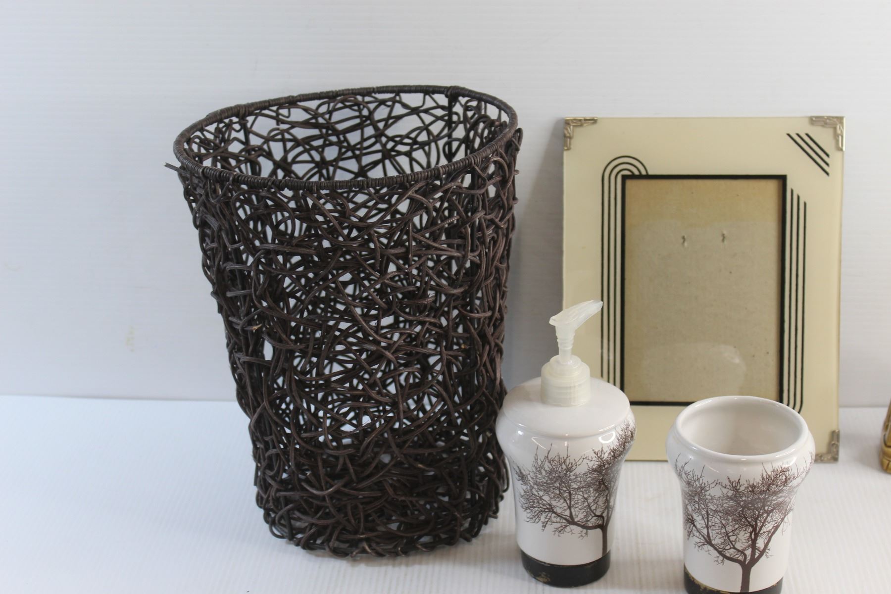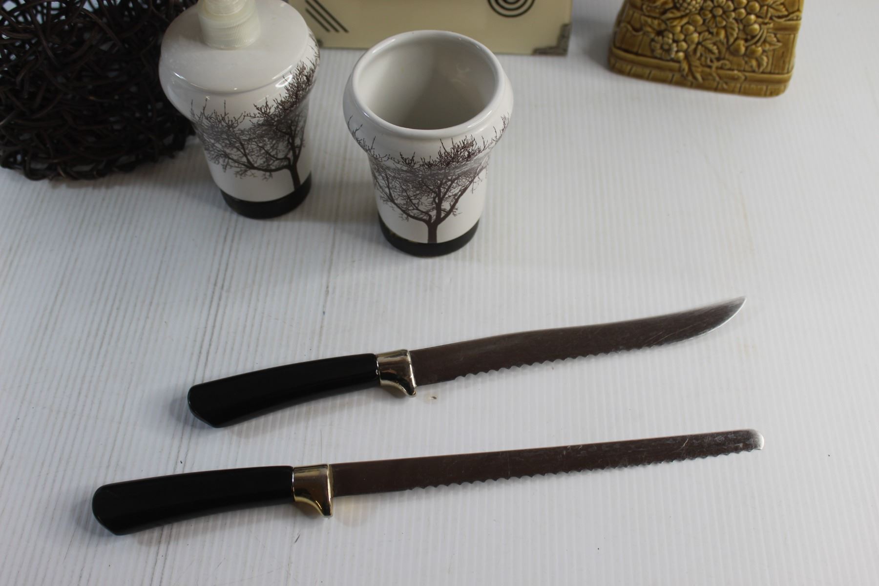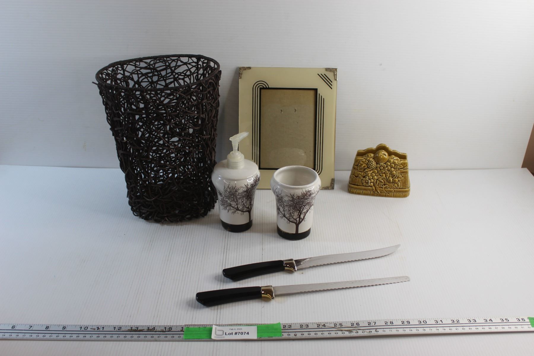 Bread Knives, Wicker Basket, Porcelain Tissue Holder, Photo Frame 7'' x 4 1/2'', Soap Dispenser and Toothbrush Cup Set