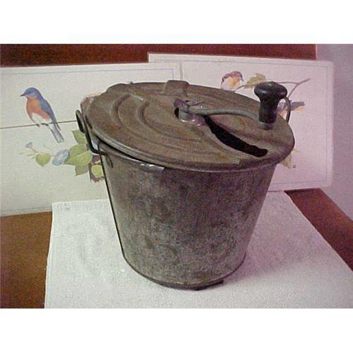 Bread Maker, all metal, hand crank with embossed instructions on cover; 12" Diameter X 10" tall to rim X 13.75" to top handle; handles both sides of top, condition good, needs cleaning before use.