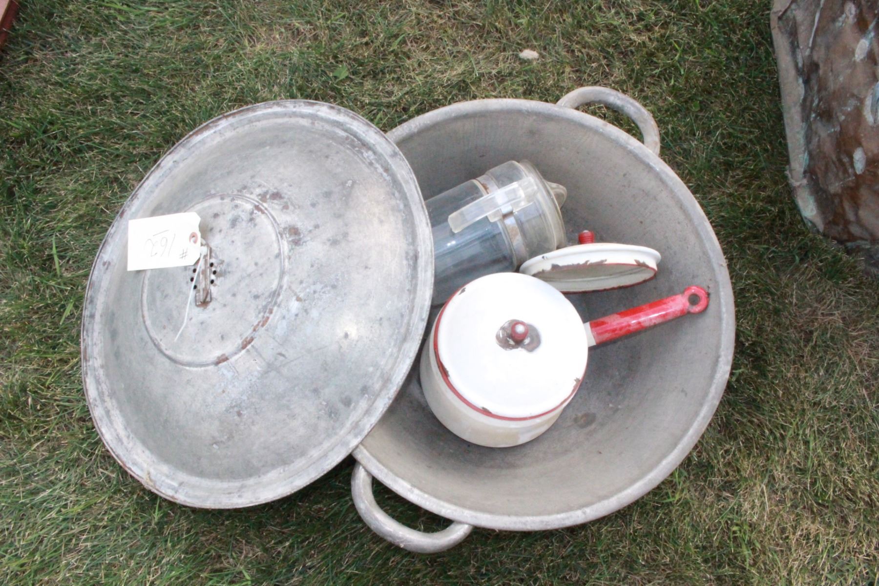 Bread Pan (no holes) with Lid; Enamelware (pot with 2 lids) and a Pyrex Coffee Perk (complete)