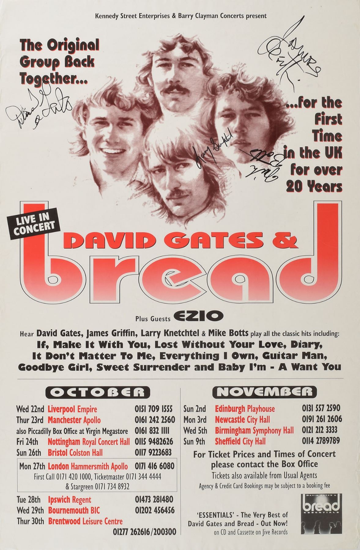 Color 20 x 30 poster for a series of Bread concerts in October and November of 1996, showing a large image of the band, with bold text reading: "The Original Group Back Together…for the First Time in the UK for over 20 Years." The poster is signed in black felt tip by David Gates, Mike Botts, James Griffith, and Larry Knechtel. Rolled and in fine condition, with scattered light creasing.