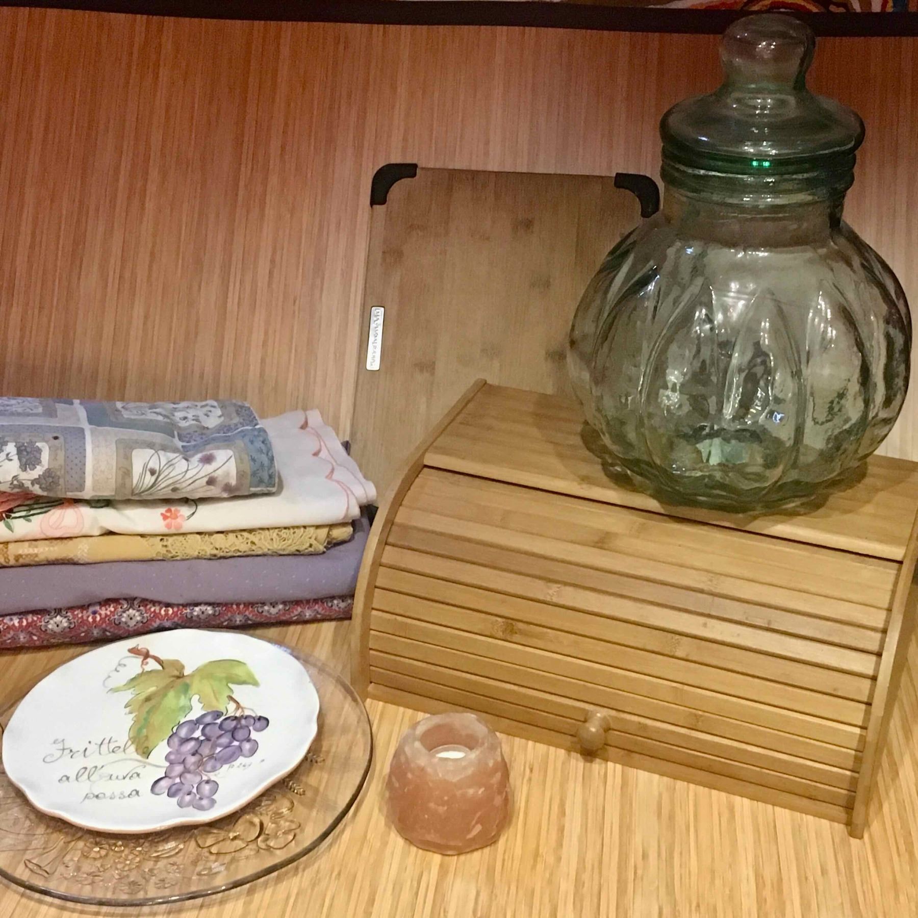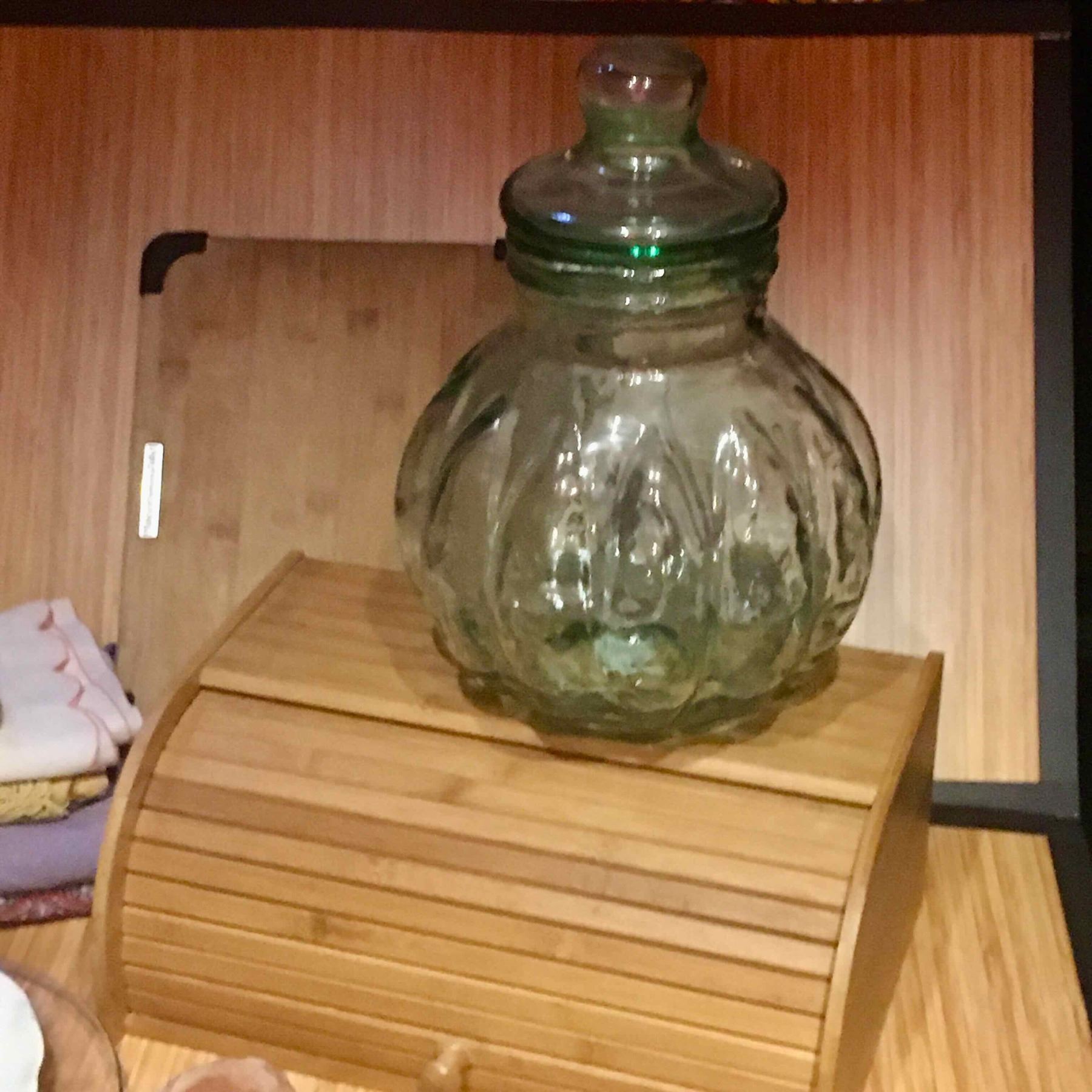 Large glass lidded storage jar, bread box, Kitchen Aid and more