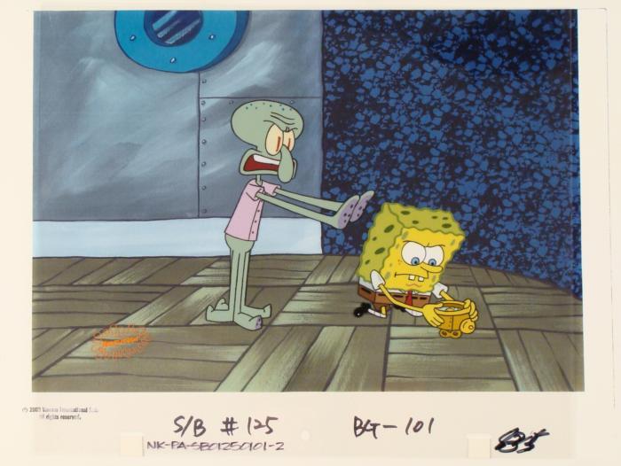 This animation cel and reproduction background are from the Nickelodeon TV show SpongeBob Squarepants. The story takes place under the deep blue sea in Bikini Bottom, where SpongeBob resides. SpongeBob, who is a yellow, porous sponge, is your typical happy-go-lucky character, as he is always cheerful and enjoys making people laugh. Patrick Star, SpongeBob's neighbor who is a starfish, is your average children's show idiot, as he boasts knowing nothing and is often getting himself into ridiculous situations. Between the homes of these two lies the home of the miserable Squidward, a squid, who is known for being grouchy and playing tricks on SpongeBob and Patrick. Both SpongeBob and Squidward work at the Krusty Krab, a fast food business run by the greedy money-loving Mr. Krabs, a crab, the arch rival of the evil, possibly misunderstood, Plankton. Another neighbor, Sandy Cheeks, an athletic squirrel who normally wears an astronaut's space suit, was introduced in "Tea at the Treedome." She spends most of her time inventing and experimenting. SpongeBob seems to be trying to break the clockOriginal Prointed Background and Animated Cel Overall Size of Background: 10 1/2" x 17" Overall Size of the Cels: 10 1/2" x 12 1/2" Very good condition This is an original hand-painted cel set-up used in the production of an episode of "SpongeBob SquarePants." Each one-of-a-kind set-up represents a slight change in position of the characters. When individually photographed and projected in rapid succession, the images appear to move.
