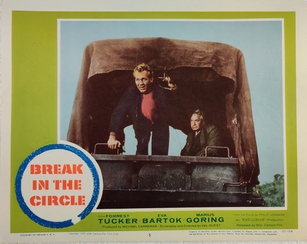 Break in the Circle (20th Century Fox, 1955) lobby card. Drama, Starring Forrest Tucker, Eva Bartok, Marius Goring, Guy Middleton, Eric Pohlmann, Arnold Marle, Fred Johnson, David King-Wood, Guido Lorraine, André Mikhelson. Directed by Val Guest. Very minor edge wear, very minor creases. Excellent.(11"x14").