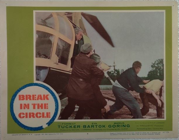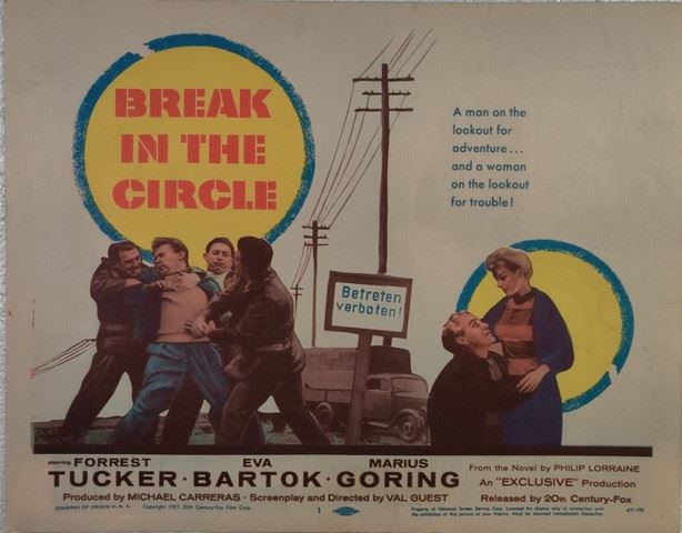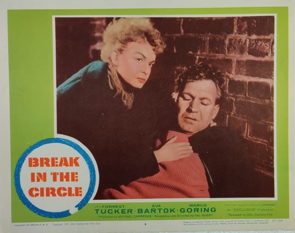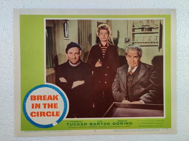 Break in the Circle (20th Century Fox, 1955) lobby card. Drama, Starring Forrest Tucker, Eva Bartok, Marius Goring, Guy Middleton, Eric Pohlmann, Arnold Marle, Fred Johnson, David King-Wood, Guido Lorraine, André Mikhelson. Directed by Val Guest. Very minor edge wear, very minor creases. Excellent.(11"x14").