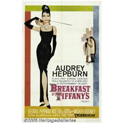 <B>Breakfast At Tiffany's (Paramount, 1961)</B></I> One Sheet (27" X 41"). Audrey Hepburn turns in the performance of her career as Holly Golightly in the classic "Breakfast at Tiffany's." To say that this is the most sought after poster of the 1960s is no exaggeration and this example is in remarkable condition. There are only a couple of pinholes in the side borders and some light smudging in the white background. There is some slight separation at the center point and a couple of small tears in the lower border. While this may sound fairly distracting, we can assure you that this is being picky and the poster displays beautifully. Very Fine+.