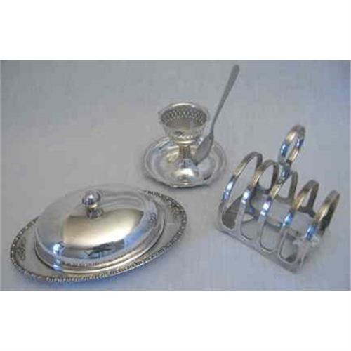 Breakfast in Style!! An Egg Cup and Spoon, A Covered Butter Dish with a glass insert and a toast rack that will hold two slices of toast cut corner to corner and inserted with the points at the top. The egg cup is marked, "EPNS England" The spoon is marked James Dixon & Co. The butter dish is marked, "Yeoman Silver plate on copper. Made in England" and the Toast Rack is marked "James Dixon & Co. All very civilised!!