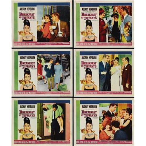 <B>Breakfast at Tiffany's (Paramount, 1961).</B></I> Lobby Cards (6) (11" X 14"). This is Blake Edwards' charming and touching romantic comedy about socialite Holly Golightly (Audrey Hepburn), who's searching for a rich man to help her escape from her reality, and her romance with a struggling young writer (George Peppard) who moves into her apartment building. Based on a best selling novel by Truman Capote, the film became the signature role for Hepburn. These lobbies are some of the most sought after in the hobby. Each card has pinholes in the borders and corners. Fine+. <BR><BR><b>Shipping:</b> Flat Material, Small (<a target="_blank" href="http://www.heritageauctions.com/common/shipping.php">view shipping information</a>)
