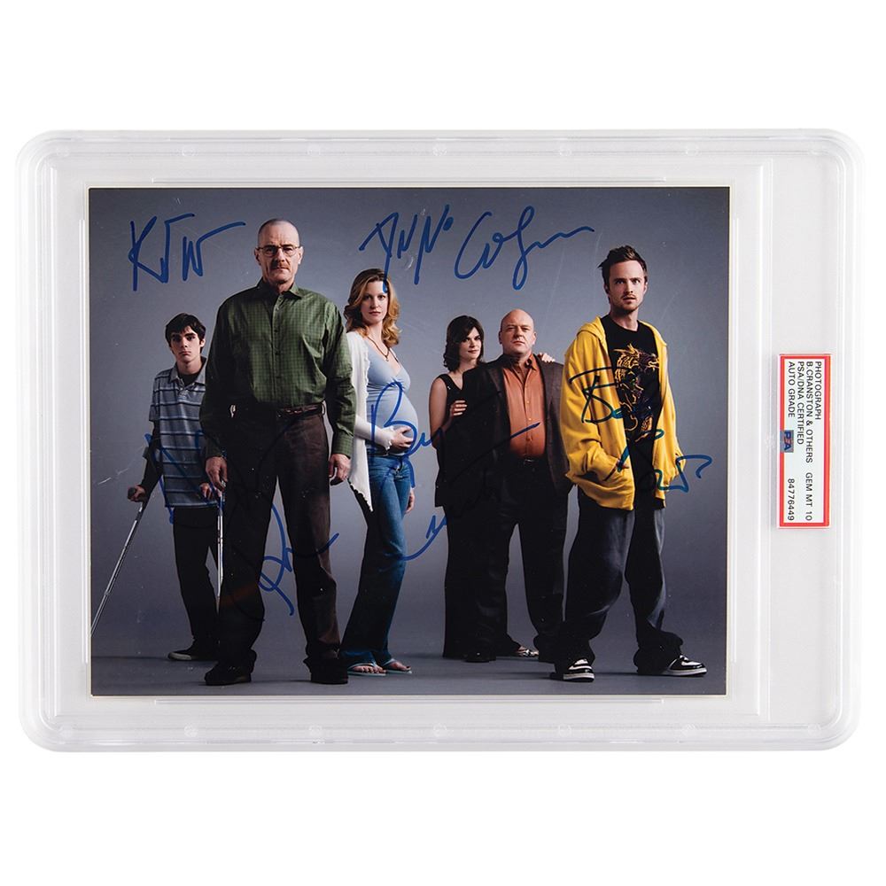 Color satin-finish 10 x 8 photo of the main cast of Breaking Bad, signed in blue felt tip by Bryan Cranston, Anna Gunn, Aaron Paul, Dean Norris, Betsy Brandt, and RJ Mitte. In very fine condition. Encapsulated and graded by PSA/DNA as "GEM MT 10."