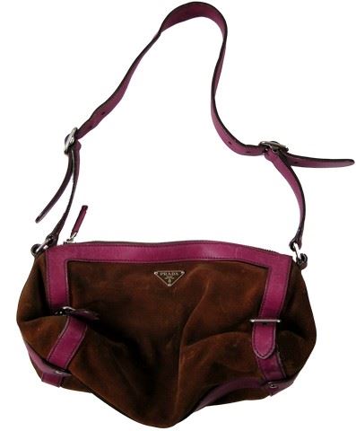 Brown suede "Prada" purse with purple leather straps used in the filming of Breaking Bad (2008-2013), the masterful TV show about a terminally ill chemistry teacher turned meth lab entrepreneur in an all-out mission to save his family from financial ruin. Approx. 15" x 6 1/2".