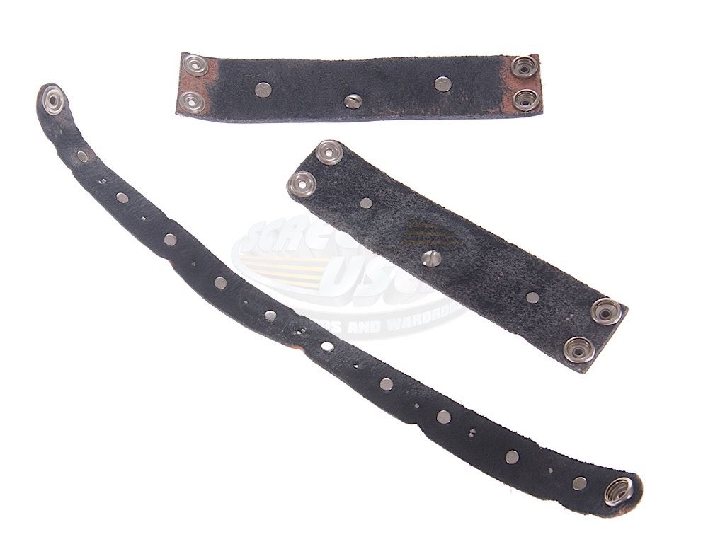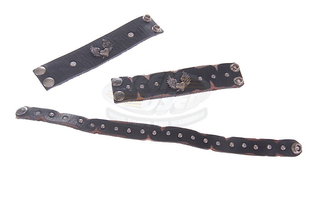 (Sony Pictures Television, 2008 - 2013) This set of three bracelets were acquired by the production for use by Krysten Ritter as "Jane Margolis" in various episodes of the series. The leather bracelets have been distressed for filming and feature metal studs and snaps. Two of the bracelets have "arrow through the heart with wings" metal charms attached. Wear from use is present.