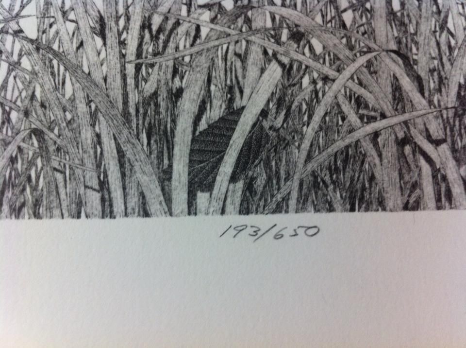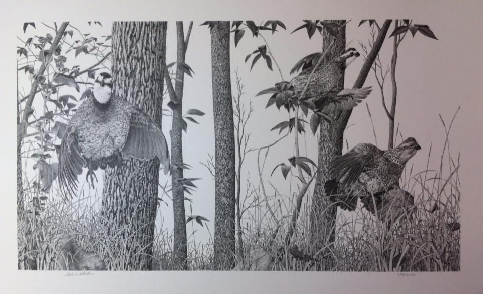 "Art of Alaska and the Pacific Northwest" "Breaking Cover" - Bobwhite Quail (pen and ink 12 x 21 Drawing Time - 587 hours) Limited Edition Print Signed and numbered 193/650 Below: Note from Artist This scene gives you a ground level view of flushing quail. A covey will often hold until you are right on top of them and then burst up in all directions. I've talked to people who've actually had them fly right into their chest! That would wake you up in a hurry. Some drawings have their own surprises that you just don't realize until they are finished. I really noticed that about the natural camouflage of these Bobwhites. Quail rely heavily on being able to hide in brushy cover and this piece shows how the feather shapes and patterns blend in well with the patterns of the bark and leaves. Imagine how tough it would be to find these little fellows if you were a fox or a weasel. Nature can be so clever. "Breaking Cover" was one of the most difficult and complex drawings I have done and won several Best of Show awards. It is available as a signed and numbered limited edition of 650 prints.
