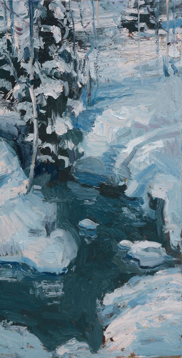 Artist: Silas Thompson. Title: Breaking Through. Medium: Oil. Size: 24" x 12". Framed size (if applicable): 18" x 30" Artist's description: There are few things in life that I find more beautiful than a stream that breaks through the grasp of the cold winter snow. Like a symbol of hope "breaking through" the cold dark of winter. It is my hope that this painting conveys the beauty that I see shown in that small spark of hope. Shipping from ZIP CODE 83323.