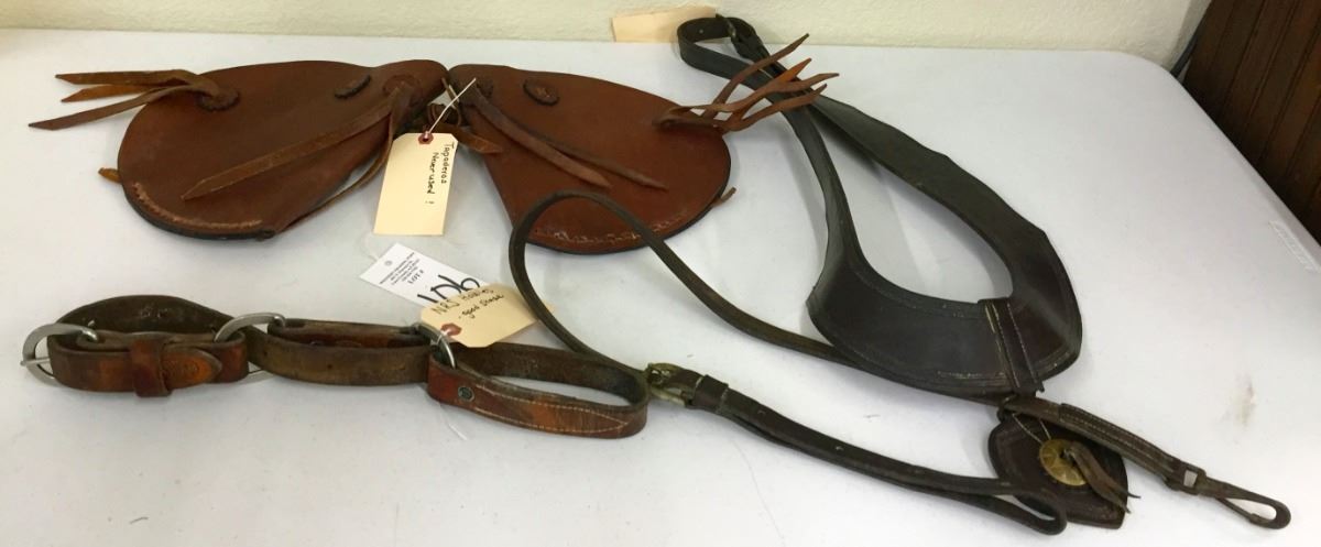 There is a good pair of leather hobbles, a stout leather breast collar and a pair of tapaderos (which appear to have been never used). Please look closely at pics as they are an important part of our description. Shipping: There will be a $7 handling / packaging fee for shipping this lot. The actual cost of postage will be added on top of that.