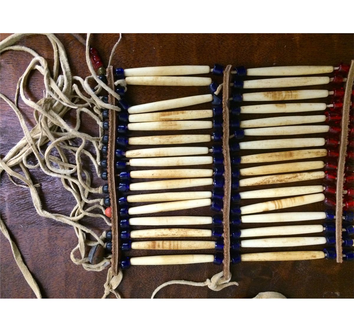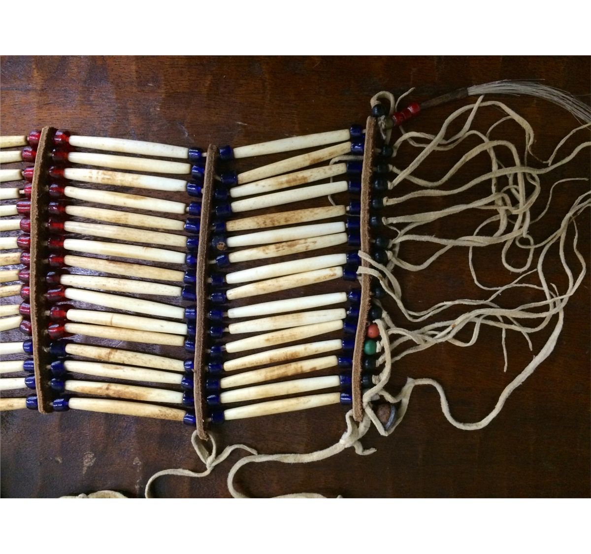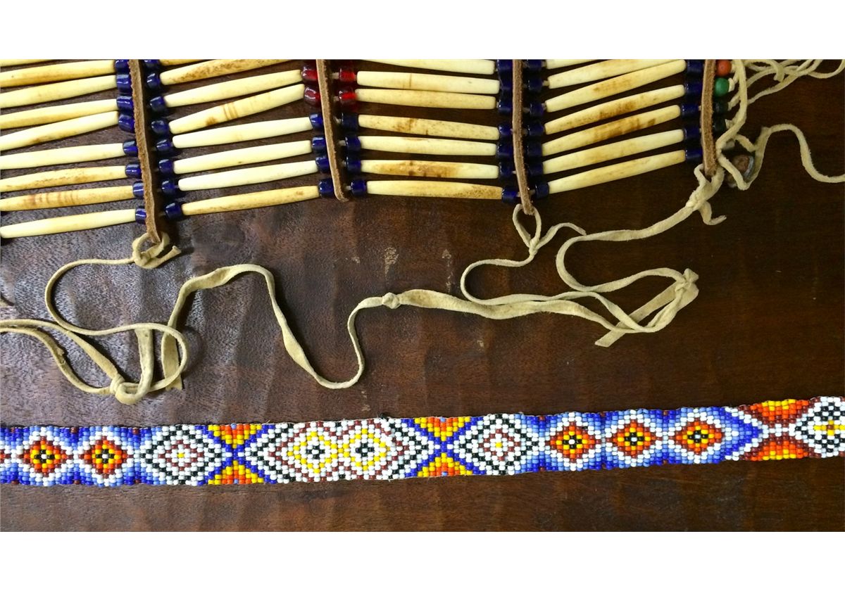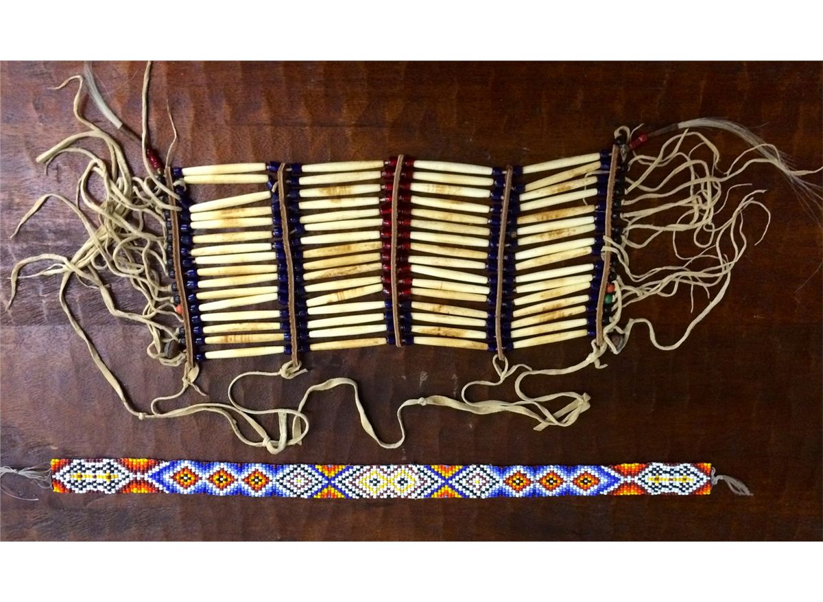 You get two vintage pieces in this lot for one price! Included is a bone and trade bead, beautifully crafted, breastplate. It appears to be Plains Indian style. Also included is a beaded headband.