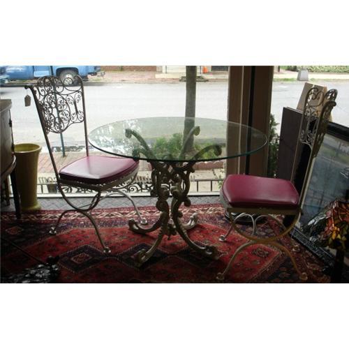 Breath Taking Wrought Iron Table Set. The set contains a base, a round glass top, and 4 chairs with pink cushions.