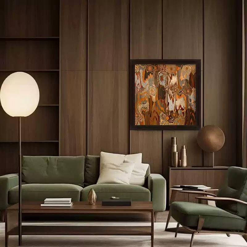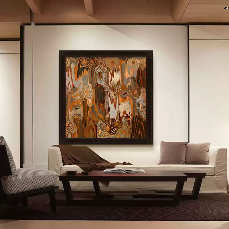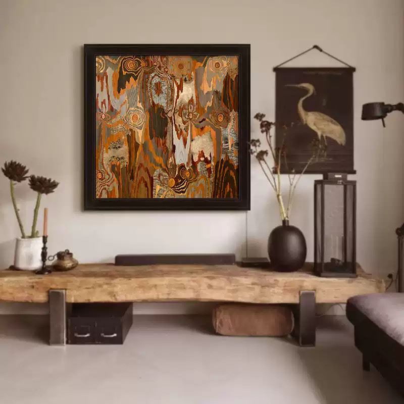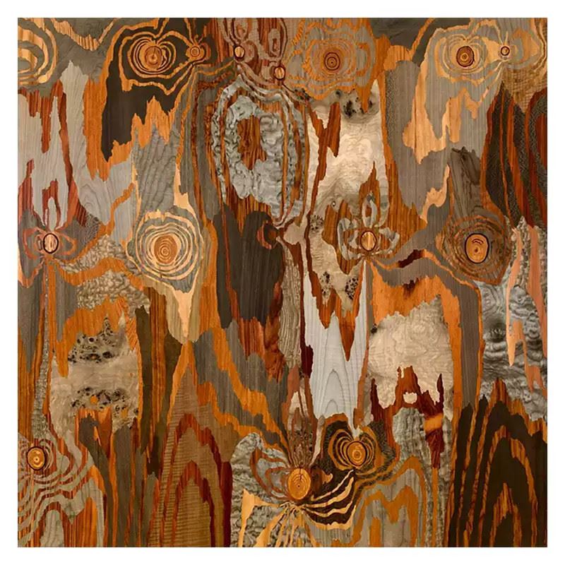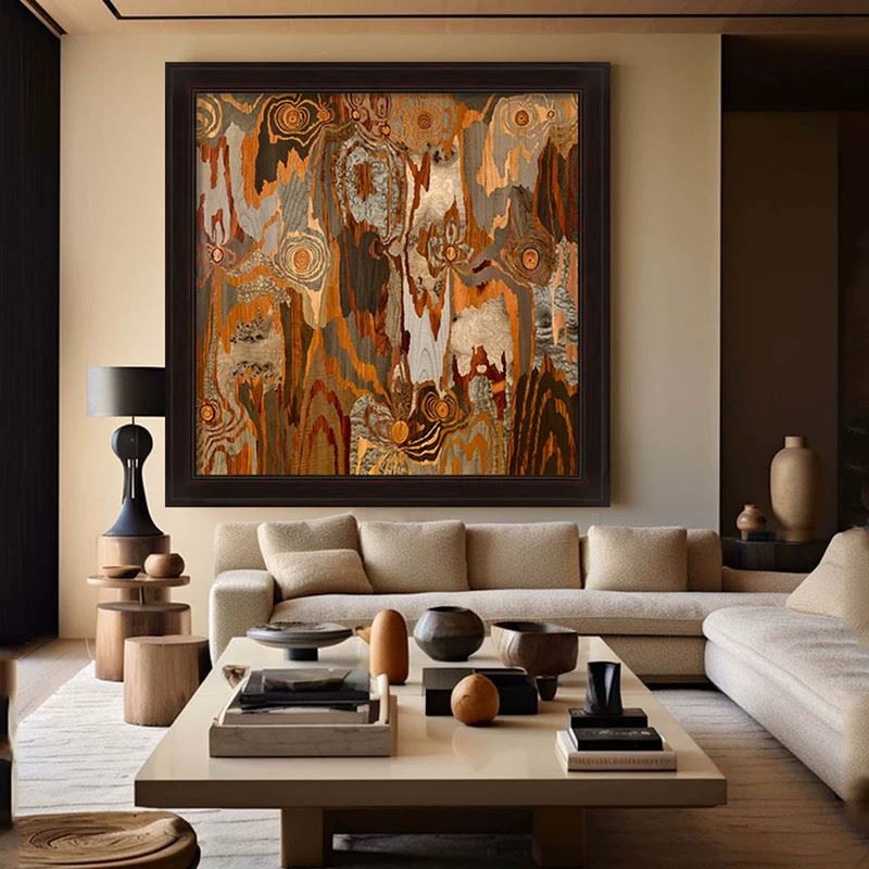 This artwork, with its intricate woodgrain textures and warm tones, illustrates the organic flow of nature. The distinct layers of color shifts resemble the silent breath of the earth, highlighting the deep connection between life and nature. Dimensions: 28 x 28 inches.