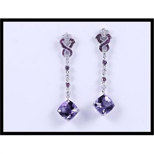 Breath-taking dangling earrings with 2 square cut amethysts that weigh 6.90 carats, 32 round cut pink sapphires that weigh 0.35 carats, and 14 full cut diamonds that weigh 0.10 carats set in 18K white gold. The earrings measure 44.6 millimeters (1.76 inches) x 9.1 millimeters (0.36 inches) and weigh 6.40 grams total weight.