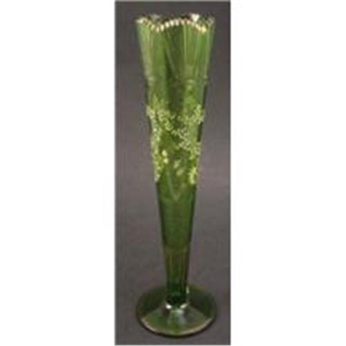 Breathtaking Hand Cut Green Glass Vase with Enamel Decoration. Totally unique. A must have!