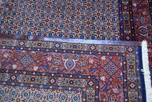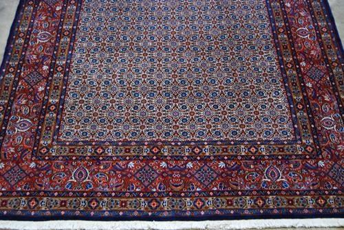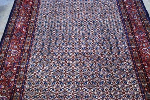 Breathtakingly splendid & intricate Persian Moud-Mashad Rug. 100%natural, vegetable dye, hand woven, pure silk and rarest baby lamb's wool pile on cotton foundation. This finely woven Moud with its all-over stylized fish design on a beige background embodies the tangible form of a simple and complex at the same time, intricately, yet marvelously executed art form underfoot. This lovely piece is masterfully hand woven, knot by knot, using superior quality baby lamb's wool and finest pure silk. It has about 200 knots per square inch and it takes over three years to weave and create this beauty. Only a master weaver would be able to weave a rug of this caliber with such highly intricate design. The lustrous and glowing silk highlights give this captivating piece an added three dimensional character. Moud is a satellite town in the proximity of Mashad, the capital of Khorasan province. However the word Moud epitomizes the finest and most fabulous rugs of the Khorasan province rug producing centers. Please notice that also attesting to the fine weave is the fact that the back of this rug looks as good as the front. The leather band sewn on the edge on the back of this rug is to prevent the edges from curling under due to the extreme tightness of the weave. Size: 9 feet 9 inches X 6 feet 8 inches. Country of Origin: Iran.