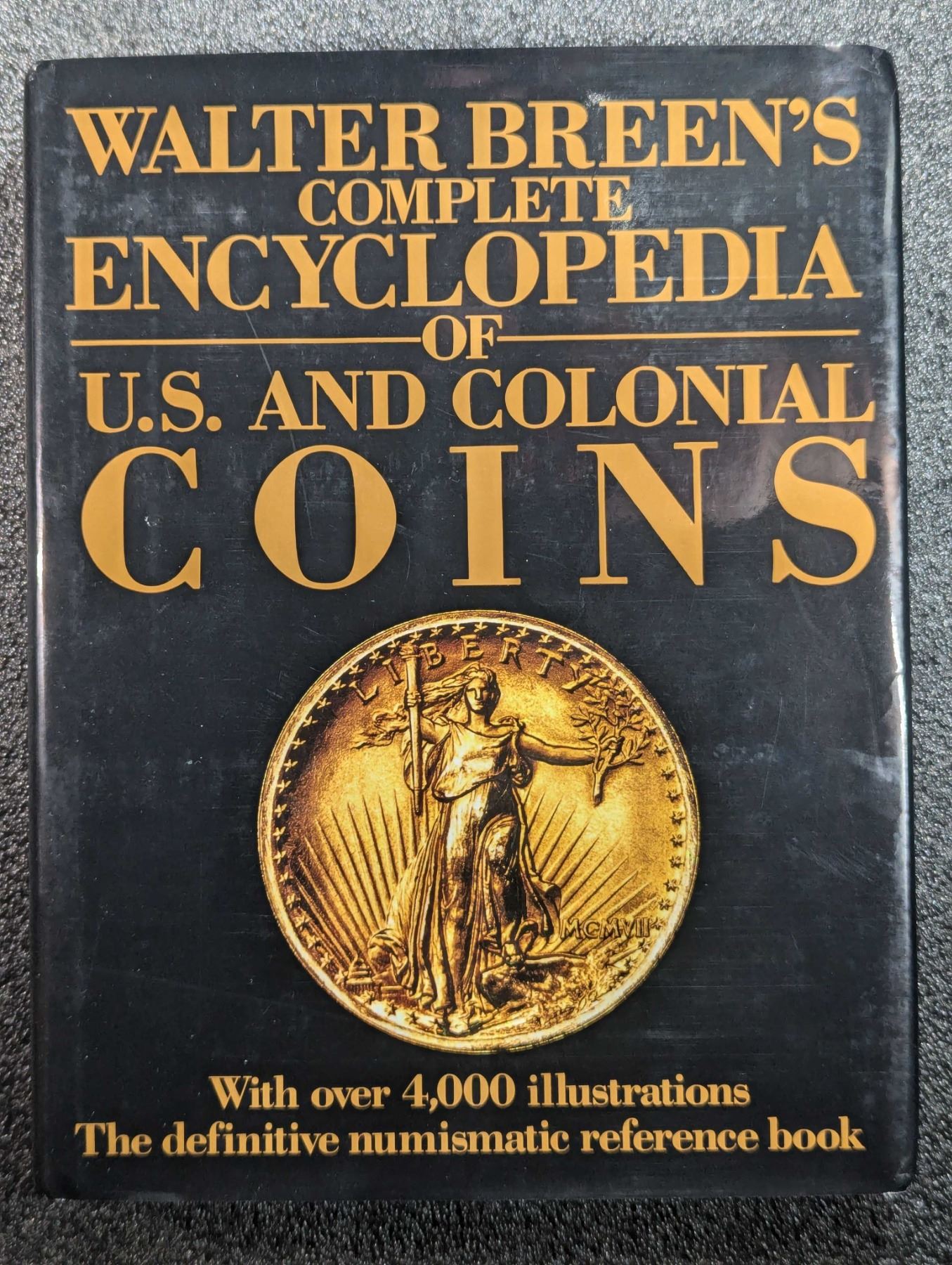 Breen, Walter. WALTER BREEN'S COMPLETE ENCYCLOPEDIA OF U.S. AND COLONIAL COINS. FCI Press, Inc/Doubleday, New York. 1988. 4to. xiv, 754 pages. original black cloth, gilt, jacket. Tables. Glossary. Bibliography. b&w coin photos throughout. English text. Fine. Drawing on a lifetime of research, America's top coin historian presents the most comprehensive guide to U.S. coins ever published. It covers every conceivable aspect of American numismatics. The definitive numismatic reference book for the advanced collector, with over 4,000 illustrations. Lot weight: 5 lbs 0oz. Subject(s): United States Coinage.