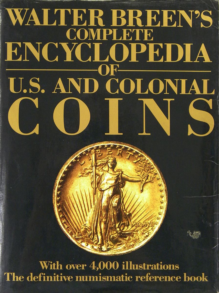 Breen, Walter. WALTER BREEN’S COMPLETE ENCYCLOPEDIA OF U.S. AND COLONIAL COINS. New York: FCI/Doubleday, 1988. 4to, original black cloth; jacket. xiv, 754 pages; illustrated. Occasional dog-ears; general wear. Very good. Probably the greatest single attempt to discuss all U.S. coinage, including colonial and private coinages, in a single volume. While some have focused on the text’s occasional errors and the volume’s production problems, it would be impossible to name another reference work that includes so much solid information on U.S. coins.